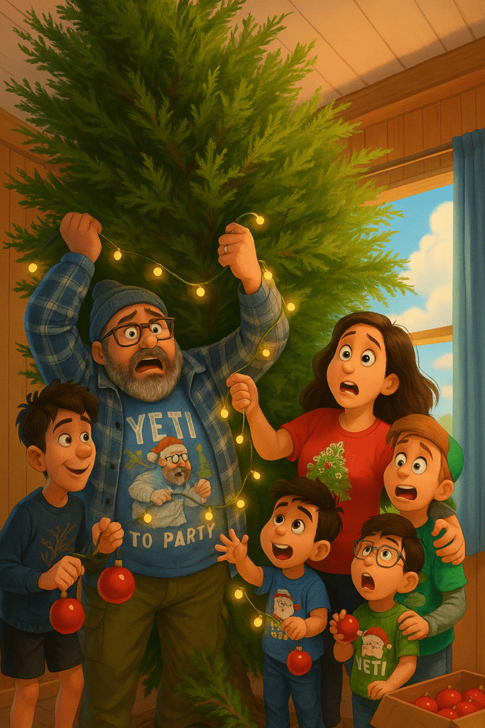 But the week wasn’t over yet! Before unpacking, Molly and the boys and I headed to a tree farm—armed with only a dollar store handsaw and blind optimism. We came home with a 12-foot Leland Cypress Christmas tree, which looks fantastic under our 8-foot ceiling. Truly a Griswold Christmas miracle.