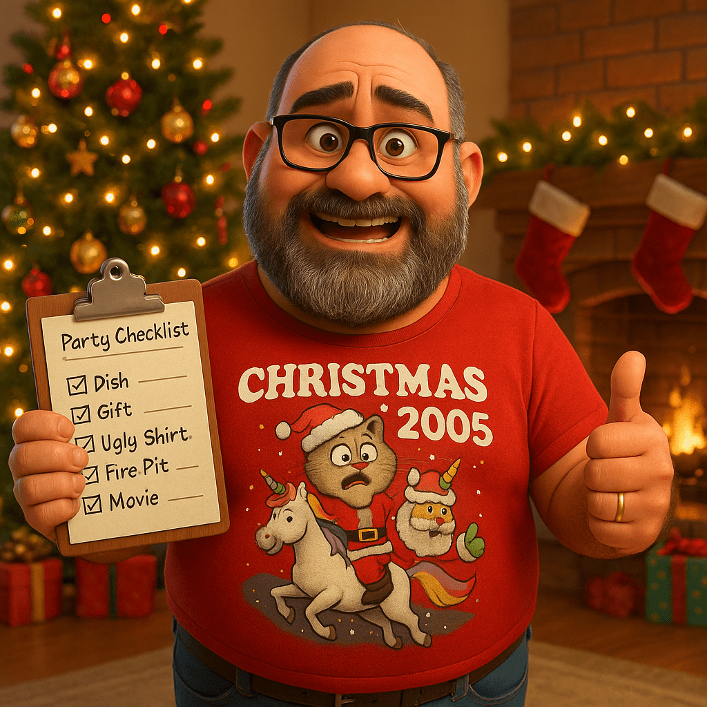 Somewhere around 2010 (give or take a year, memory, or gumbo spill), we accidentally started a tradition. A Christmas party. Potluck-style. Gumbo on the stove. Cheap gifts. Friends packed into a house that was never designed for this many people… and yet somehow always works.